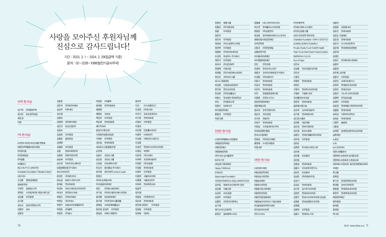 나눔이야기 2023 기부금 연차보고서 관리자 2023-06-01 조회수 37885 2023 기부금 연차보고서.pdf 목록 이전글2022 기부금 연차보고서 다음글2024 기부금 연차보고서