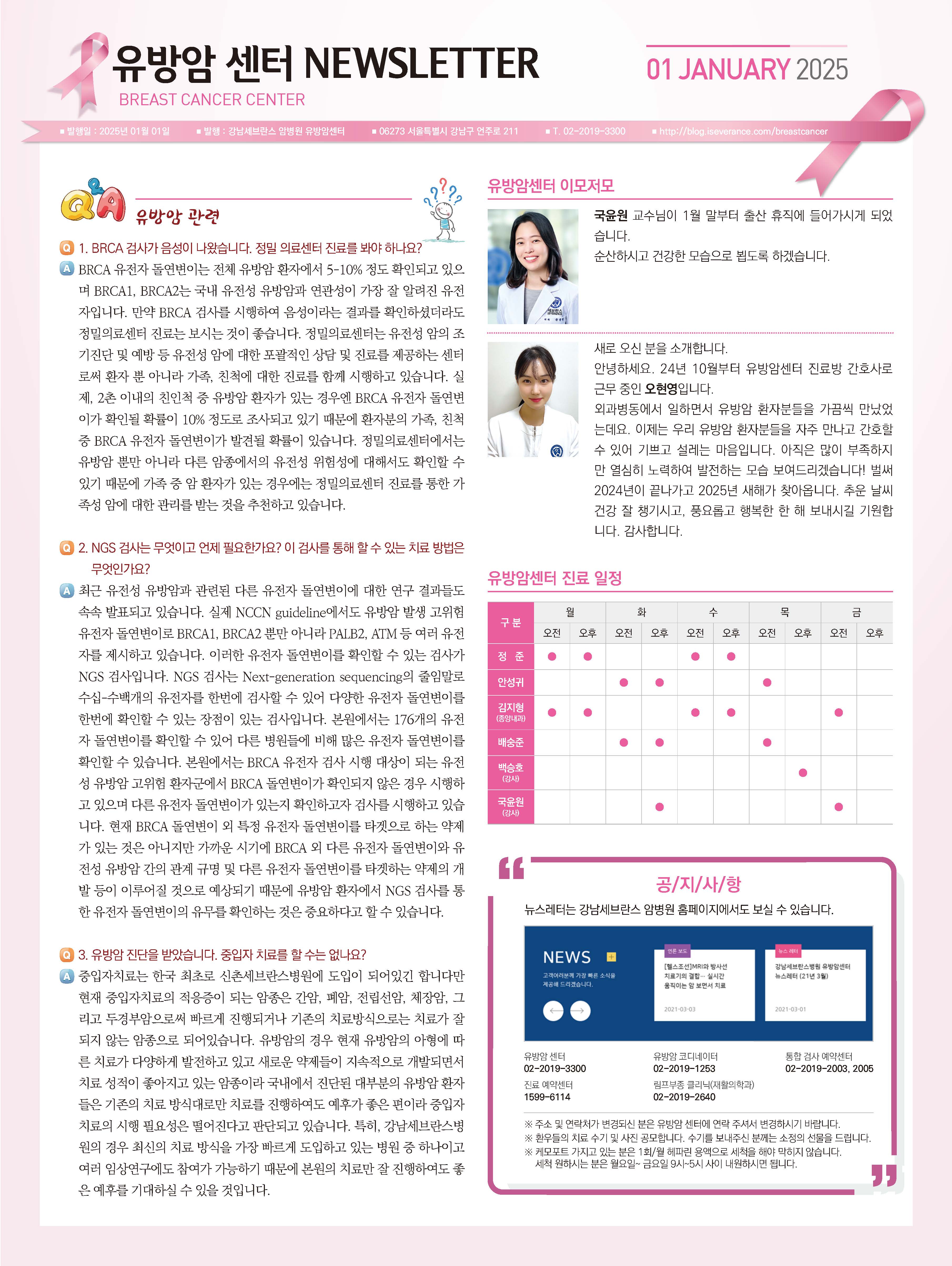 뉴스레터 강남세브란스암병원 유방암센터 뉴스레터 (2025년 1월) 관리자 2025-01-16 조회수 2933 목록 이전글강남세브란스암병원 유방암센터 뉴스레터 (2024년 10월) 다음글강남세브란스암병원 유방암센터 뉴스레터 (2025년 4월)